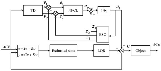 The proposed control strategy is a combination of the LQR and ADRC; the diagram of the controller is shown in Figure 3. In a power system interconnected by i regions, an i-th controller is necessary. Thus, the strategy includes an ADRC and LQR-based LFC strategy to adjust the frequency deviation and the ACE within each control region. Given a hybrid power system model, the LQR is employed to effectively manage the overall errors of the ACEs and frequency deviations within a specified range. Additionally, the ADRC is utilized as a precise controller for the ACEs and frequency deviations. In this diagram, the upper half part is the ADRC strategy, and the lower part is the revised LQR strategy. The details of the Tracking Differentiator (TD) and NFCL blocks are given in [].