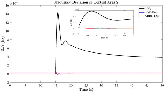 In Figure 5, the steady-state error of region 2 is 3.9 × 10−3 Hz by using the LQR method. The steady-state error is 0 when using the LQR with ESO and the proposed methods. From the enlarged small window, it can be seen that the frequency deviation of the LQR with ESO has two peaks from 15 to 15.3 s, among which the maximum peak value is 0.8 × 10−3 Hz. The method proposed in this paper has basically no fluctuation on the basis of error perturbation, and the maximum peak value is 0.04 × 10−3 Hz. Compared with the LQR with ESO, the relative error of the maximum peak is reduced by 95% by using the proposed strategy.