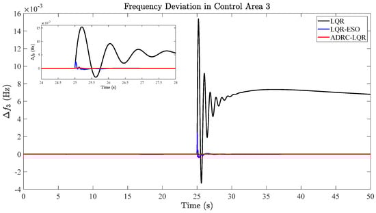 Comparative results of reducing frequency deviation and tie-line power variation using LQR, LQR with ESO [], and the proposed method are presented and analyzed.