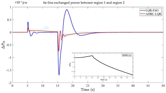 Suppose that the first region is interfered with by a step load disturbance at t1 = 5 s, = 1 p.u; t2 = 15 s, = 2 p.u and t3 = 25 s, = 1.5 p.u. The response results of the frequency deviation of the three regions are shown in Figure 4, Figure 5 and Figure 6, respectively. The tie-line power exchanges of the three regions are displayed in Figure 7, Figure 8 and Figure 9. The optimization results of different methods, such as LQR, ESO-LQR, and the proposed optimal ADRC, which is marked as ADRC-LQR, are also presented. In order to better observe the results of the comparison, the dramatically changed parts have been enlarged in the small images.