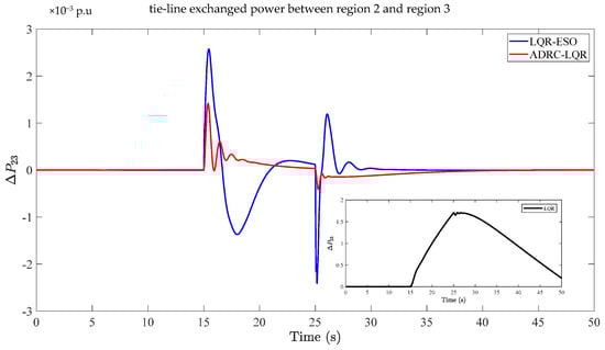 In Figure 8, the exchanged power between region 2 and region 3 does not reach a stable state within 50 s when using the LQR method. The system reached a stable state in 40 s, with four distinct peaks in the intermediate region by using the LQR with ESO. The absolute errors are 2.6 × 10−3 p.u, 1.3 × 10−3 p.u, 2.4 × 10−3 p.u, and 1.1 × 10−3 p.u, respectively. By using the method proposed in this paper, the system reached a stable state in 32 s. Four peaks can be found in the corresponding period, but the fluctuation range is significantly smaller, and the absolute errors are 1.2 × 10−3 p.u, 0.4 × 10−3 p.u, 0.2 × 10−3 p.u, and 0.4 × 10−3 p.u. Compared with the LQR with ESO, the relative errors of the maximum peak fluctuation are reduced by 54% by using the proposed strategy.