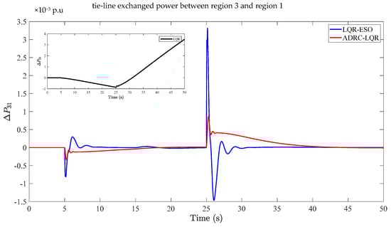 In Figure 9, the exchanged power between region 3 and region 1 does not reach a stable state within 50 s by using the LQR method. The system reached a stable state in 40 s, with four distinct peaks in the central region. The absolute errors are 0.8 × 10−3 p.u, 0.3 × 10−3 p.u, 3.4 × 10−3 p.u, and 1.5 × 10−3 p.u, respectively. By using the proposed optimal ADRC, the system reached a stable state in 32 s, and four peaks can be found in the corresponding period, but the fluctuation range is significantly smaller, and the absolute errors are 0.3 × 10−3 p.u, 0.1 × 10−3 p.u, 0.8 × 10−3 p.u, and 0.3 × 10−3 p.u. Compared with the LQR with ESO, the relative errors of the maximum peak fluctuation are reduced by 76% by using the proposed strategy.