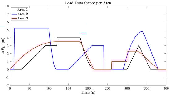 It is assumed that all control areas are equipped with a PVG functioning as a negative load and the variation in its irradiance is considered to be random. The load disturbance signals for each control area are illustrated in Figure 10. These signals consist of step, triangular, and parabolic patterns. It can be seen from Table 2, Table 3 and Table 4 that the proportion of new energy added in the three regions is basically balanced, and the same disturbance signal has little disturbance to the three regions. Figure 10 verifies the robustness of the proposed method to the three types of disturbance signals.