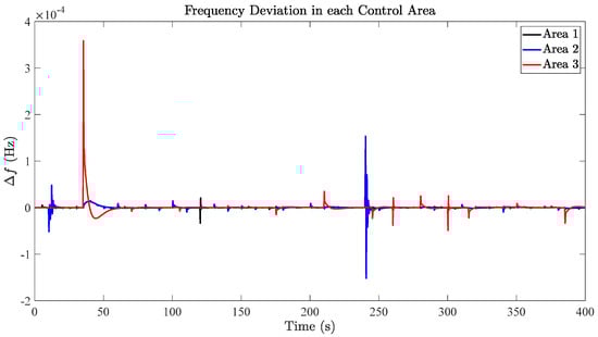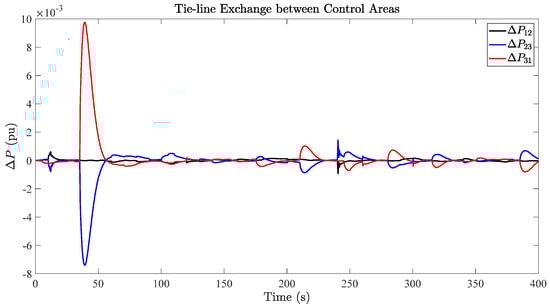 The effectiveness of using the proposed optimal ADRC strategy is demonstrated in Figure 11. The proposed LFC strategy successfully keeps the frequency deviation near zero in all regions, even in the presence of load disturbances and unpredictable fluctuations in the functioning of the PVGs acting as negative loads. The area where the maximum frequency deviation is observed is area 3, with a value of only 3.7 × 10−4 Hz. Additionally, the proposed strategy effectively governs the power exchange between control areas through the tie-line in Figure 12. The maximum deviation in tie-line power is approximately 9.8 × 10−3 p.u.