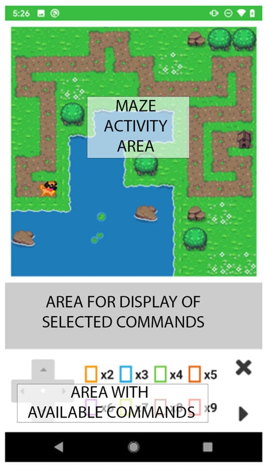 Among young learners, programming goes beyond simply writing code. It introduces them to computational thinking, which involves problem-solving using computer science concepts such as abstraction and decomposition. One way to teach children the basic programming concepts is through maze-based problems. A maze is a type of game in which a player navigates through branching pathways to find an exit or reach specific targets [1]. In the context of learning basic programming concepts, maze-based problems and games guide even the youngest learners on how to break down the problem into smaller tasks [2,3]. More precisely, this approach requires them to identify the sequence of steps required to navigate (e.g., move forward, move left, and move right) through the maze or game board to reach a certain point or complete a task. Depending on the child’s age, these games can be designed as unplugged activities, i.e., activities without the use of a computer and digital screens, activities with programmable robotic toys, mobile, web or desktop applications [4].