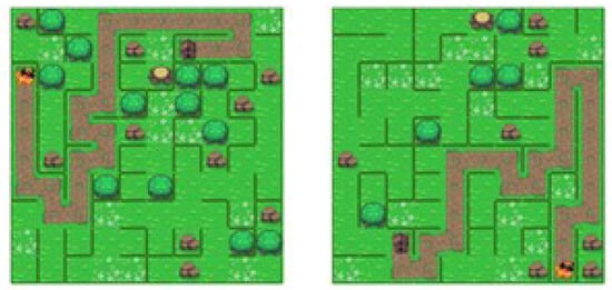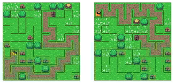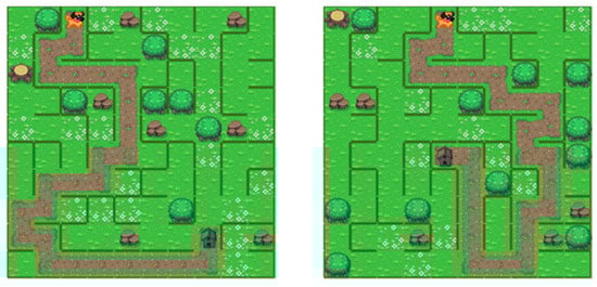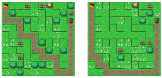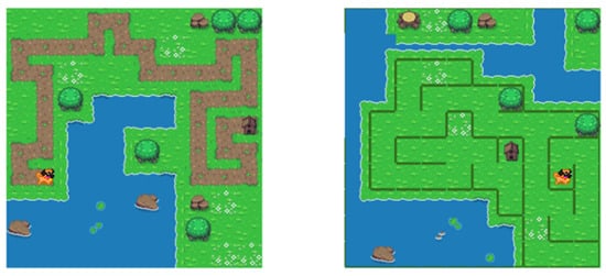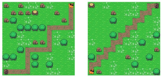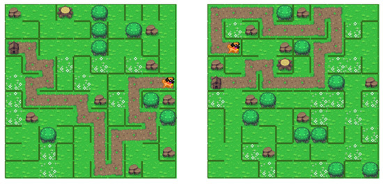 Additionally, the game offers an option to generate a maze without a visible path. If the option for path generating is not chosen, the user has the freedom to navigate throughout the entire board within the boundaries of the maze’s structure. The purpose of this mode is to generate levels of escalating complexity, where the dog and his house are strategically positioned to ensure that the road connecting them is the longest route within the maze. The approach relies on constructing a maze structure that is characterized as a rectangular grid with an equal number of rows and columns. Employing such a framework ensures the achievement of effective level generation by preventing the creation of self-intersecting paths, a scenario that would not be feasible with a purely random approach. Both modes are depicted in Figure 5.