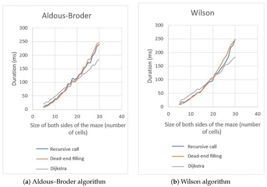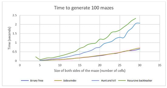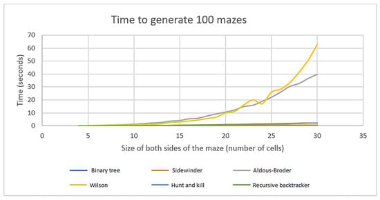 To analyze and compare the maze generation times of the implemented algorithms, the time taken to generate each of 100 mazes per algorithm was measured using a built-in software timer. Through data analysis, it was determined that Wilson’s algorithm and the Aldous–Broder algorithm stand out compared to the other methods (Figure 14). The time required to build the maze increased exponentially as the maze size increased. This impacts these algorithms most, as they need to visit every cell.