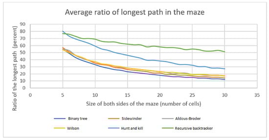 The relationship between maze size and the ratio of the longest path is easily understood: as the maze size increases, the ratio of the longest way decreases. The majority of algorithms yield comparable outcomes in this context. However, the Hunt and Kill algorithm and the Recursive backtracker method are particularly noteworthy. Their usage is significantly high. However, it declines with the size, albeit to a lesser extent compared to other methods. It is worth noting that the game’s first levels tend to be relatively simple and have short routes. Therefore, the demand for this aspect is not very crucial. However, as the game progresses to more difficult levels, this demand becomes more substantial and should be considered.
