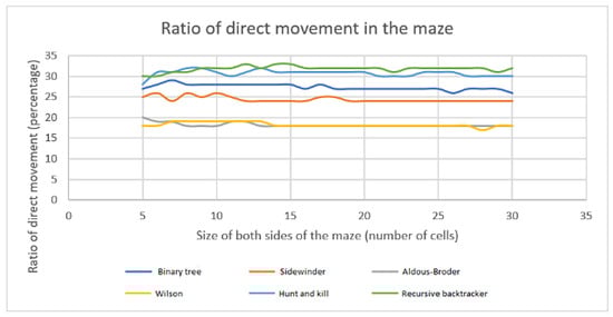 Introductory levels designed to familiarize users with the game should possess specific attributes. The solutions should be straightforward, with little changes in direction and a preference for long corridors of interconnected cells. These pathways facilitate the input of commands and loops more straightforwardly while reducing visual complexity to prevent the perception of the game from being excessively challenging. An analysis was conducted to determine appropriate algorithms for generating these levels. Each algorithm has generated a hundred mazes of varying sizes to compare the different methods of navigating through the maze. Given that the game chooses the path randomly, all cells have been adequately accounted for. The count of cells in the maze restricted to movement in only two perpendicular directions (east–west and north–south) was established, and the ratio of these cells to the total number of cells was computed. The findings are depicted in Figure 17.