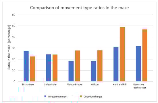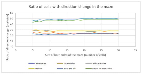 The analysis shows that the ratio described remains constant across different maze sizes, but it does vary based on the technique used. The Hunt and Kill algorithm and the Recursive backtracker method exhibit the highest ratio, within the 28 to 32 percent range. The Aldous–Broder and Wilson’s algorithms exhibit the smallest ratio, within the 18 to 20 percent range. Another factor to consider is the proportion of cells that necessitate a change in orientation. The higher the percentage, the more difficult the maze becomes, necessitating more commands to solve the problem. The pathways can be enhanced aesthetically and present a greater level of difficulty in the advanced stages of the game. The outcomes of the analysis from the simulation are presented in Figure 18.