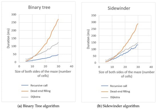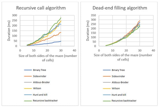 Choosing an optimal algorithm to solve the generated maze was necessary to optimize the application’s performance. The solving time of one hundred mazes generated with varying dimensions, ranging from 5 to 30 cells per axis, was analyzed. This process was performed for each algorithm and each instance of the maze, with the total duration calculated by summing up the individual times. The device utilized for the simulation remained unchanged from the preceding section. An examination of the solution time utilizing the Recursive call algorithm reveals that the time is comparable for the majority of algorithms, except for instances when the labyrinth is created by the Sidewinder algorithm, in which case, the time is even quicker when the Binary Tree algorithm generates the maze. For solving the maze with the dead-end filling algorithm, the solution size is similar regardless of which algorithm has been used to generate the maze. These are depicted in Figure 20.