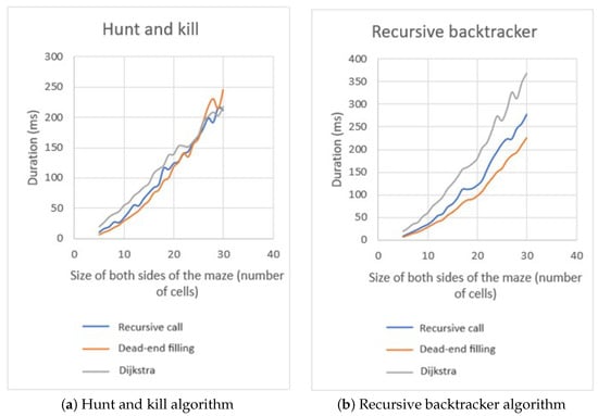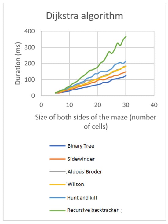Comparable outcomes are demonstrated when the mazes are generated using the Hunt and Kill algorithm, which resembles the Aldous–Broder algorithm and utilizes random direction selection. The distinction lies in the necessity of choosing among unvisited cells. The distinction between the solving algorithms becomes evident when solving the recursive backtracker mazes (Figure 24). The dead-end filling algorithm repeatedly shows superior performance regardless of maze sizes. This is because these types of mazes contain limited pathways that lead to a dead end. By comparison, the mazes produced by the Binary Tree algorithm and the Sidewinder algorithm have numerous dead ends, whilst the Dead-end filling technique exhibits the poorest performance. Moreover, the Dijkstra method exhibits a slower performance mostly because these mazes contain a significant proportion of lengthy paths with minimal changes in direction within their structure.