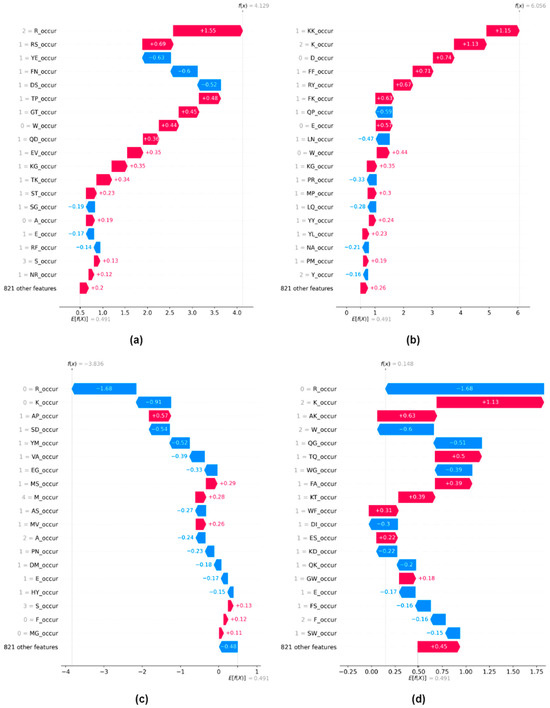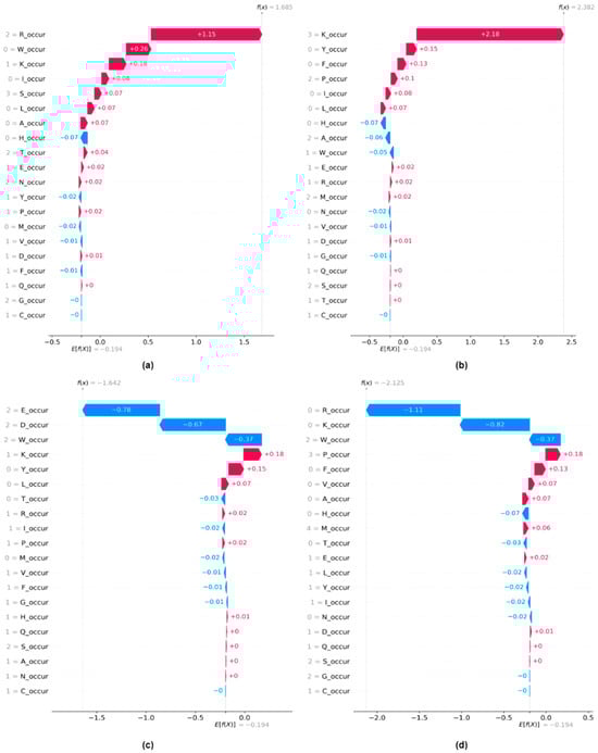 Finally, we explore both the local and global explanations for Monogram occurrence features. We observed that using monogram features alone for training our machine learning model yields the best performance in distinguishing protein-binding peptides from non-binding peptides. Figure 4 shows the waterfall plot for four instances from the test dataset. Figure 4a,b depict two samples for which the model predicts positive sites, and Figure 4c,d show samples for which the model is showing strong confidence in assigning them to the negative class.