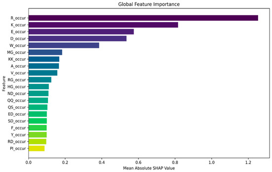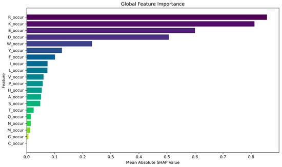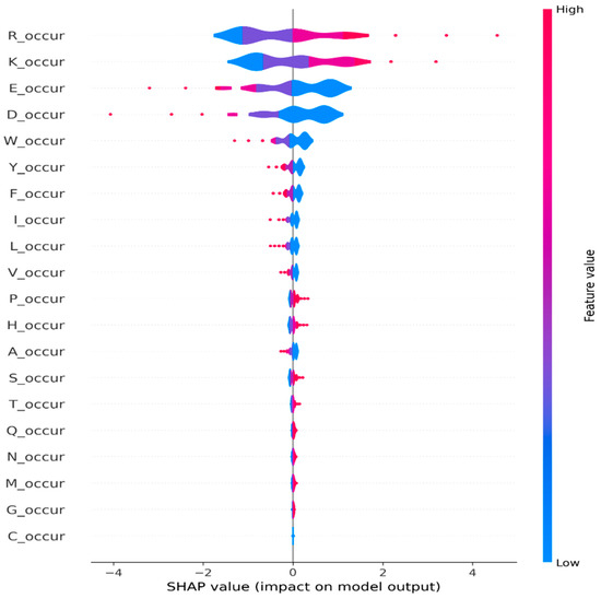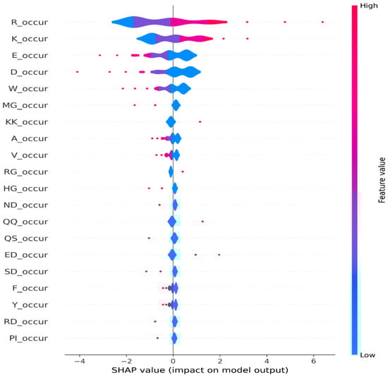 To further investigate the efficacy of amino acid occurrence-based features in our task, we delved into global-level explanations. Leveraging the SHAP library, we computed the global feature importance, which provides a holistic view of each feature’s contribution to the model’s predictions across the entire dataset. We computed the global feature importance by taking the mean absolute SHAP values across all samples. Figure 2 depicts the top 20 features contributing towards model prediction across all samples. In addition, we generated a summary plot using the violine plot type from the SHAP library, which displays the distribution and density of SHAP values for their respective feature. In Figure 3, we present a violine summary plot highlighting the top feature filtered from the pool of 840 n-gram features. Together, these figures strongly indicate the pivotal role of amino acid occurrence-based features in driving the model’s prediction.