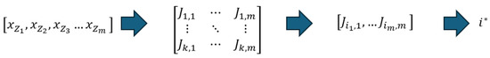 where is the real standardized value and the predicted standardized value. For each algorithm, the necessary time for obtaining the predicted value is also measured. In this way, a performance index is evaluated: the higher J is, the better the algorithm’s performance. Then, for each variable , the algorithm number , , with the highest J, i.e., , is chosen. Finally, algorithm number , which presents the highest J for the largest number of times, is selected for the overall prediction. The procedure is summarized in Figure 1.