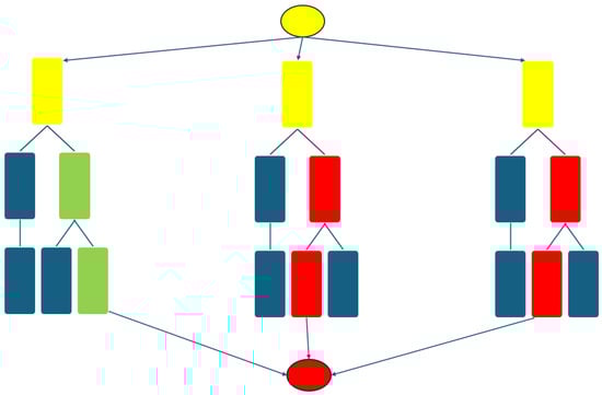 For example, Figure 3 shows an RF composed of three decision trees: the yellow circle is the RF input; the yellow rectangle is the root node of the decision trees. Since the input is the same for all trees, the first node has the same color (yellow). Then, based on the decision taken by each tree, the internal nodes and the leaves have different colors. Two out of the three displayed trees produce the same output, the red one, which is chosen as the global output with the same color (red circle).