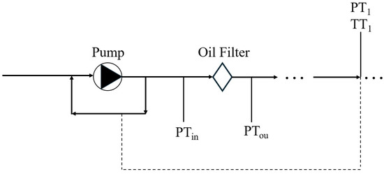 We chose the oil filter as the first element to which to apply the ML algorithms. Figure 4 shows the simplified circuit with the employed sensors: PT is a pressure sensor and TT a temperature sensor.