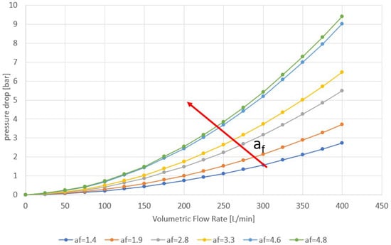 Since the pressure drop is a quadratic function of the volumetric flow rate, both nominal and excessive clogging are simulated by multiplying the function by a coefficient , as shown in Figure 5 and explained in [51].