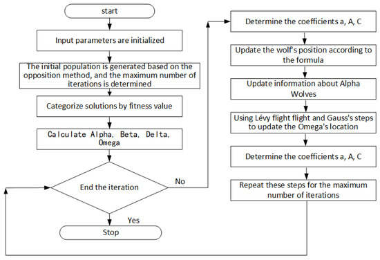 Flowchart of the grey wolf optimizer based on the opposing gradient.