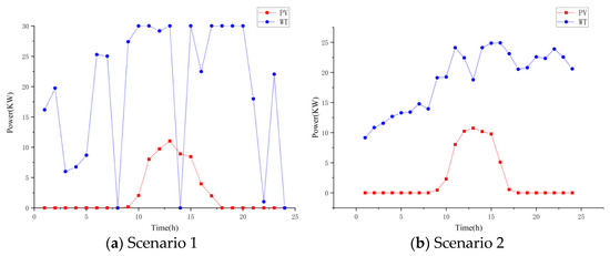 (5) The output power of wind turbines and photovoltaic power generation introduced in this paper is taken from the typical daily power generation data in East China on December 29. The wind and solar energy output curves for Scenario 1 are shown in Figure 2a and the wind and solar energy output curves for Scenario 2 are shown in Figure 2b.