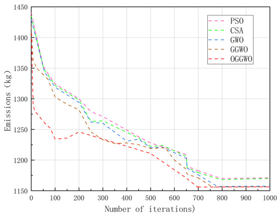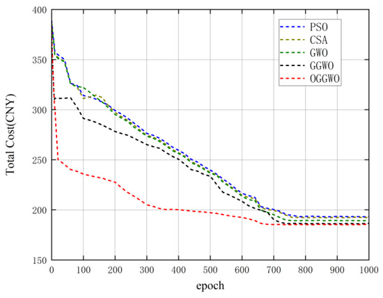 The cost deviation and emission deviation of the OGGWO algorithm proposed in this paper in Scenario 2 are CNY 33.34 and 4.46 kg, respectively. The minimum emission is 1156.79 kg and the minimum cost is CNY 1457.80, both of which are lower than other optimization algorithms. This indicates that the OGGWO algorithm proposed in this paper obtains better results in Scenario 2, and as shown in Figure 8, the convergence speed of the OGGWO algorithm proposed in this paper is faster in Scenario 1.