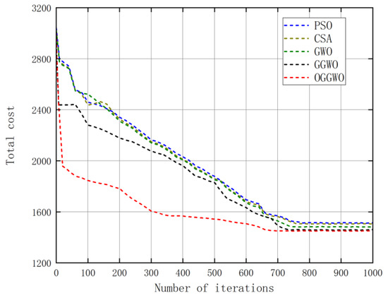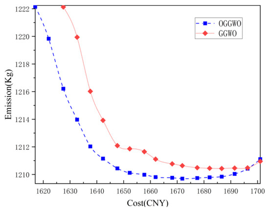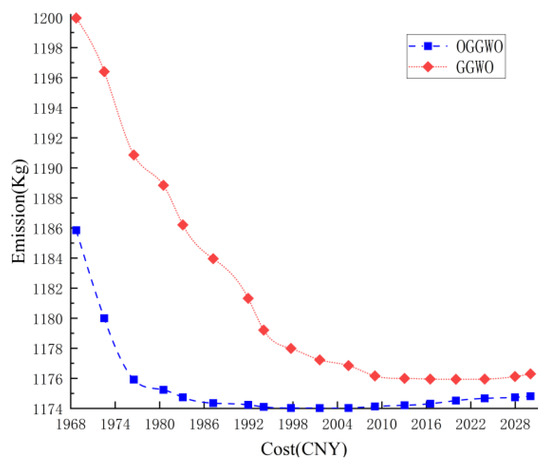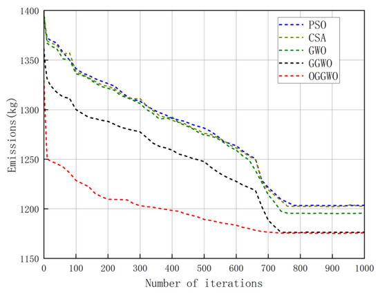 In order to highlight the superiority of the proposed OGGWO algorithm in Scenario 1, this paper compared the simulation results with other classic optimization algorithms in Table 5. It can be seen that the standard deviation values of the cost and emission targets of the proposed OGGWO are 19.97 and 4.72, respectively, with a minimum cost of 1146.55, minimum emissions of 1262.74, and a BCS of 1223.83, which are the minimum values compared to other classical optimization algorithms.