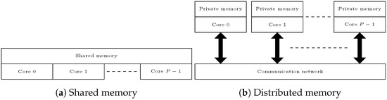 DM architectures are inherently different from SM architectures and consist of P machines interconnected by a common communication network. Each machine has one processor (or core—the terms in this paper are used interchangeably to make the terminology of distributed and shared memory architectures as consistent as possible) and a private memory. Therefore, each core can only directly access its own private memory, and the sharing of information between the cores happens through message exchange across the common communication network. Figure 1b illustrates this architecture. DM provides two advantages with respect to SM architectures. The first is that memory contention is not an issue for DM, as each core only has access to its private memory, meaning that the scalability is often better in memory-intensive applications. As previously mentioned, the second advantage is that DM architectures typically have more cores, which means that, for any given application, the maximum achievable speed-up on DM is typically higher than the same on SM. On the other hand, the two disadvantages are that the communication between the cores is naturally more intensive than on SM, and DM architectures are also more expensive to use and maintain, due to the more complex infrastructure required. In this work, we use the Message Passing Interface (MPI), arguably the most commonly used parallel programming model for DM. MPI provides routines, such as MPI_Send, MPI_Recv, or MPI_Sendrecv, to send and/or receive explicit messages (of a user-specified size) between a core i and a core j. Further details are omitted for brevity.