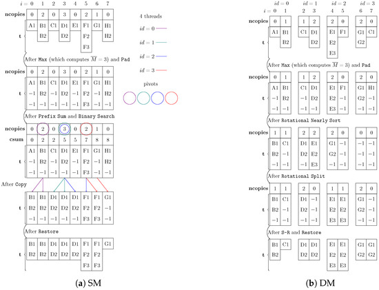 Indeed, since the workload is divided according to and Equation (19), if two or more cores share the same pivot, only the core with the highest must create less than copies of . We note that, since this algorithm is designed to run on SM, in this step, it is strongly recommended to use a temporary array to which the samples are temporarily copied, such that the parallel cores do not risk overwriting sensitive information.