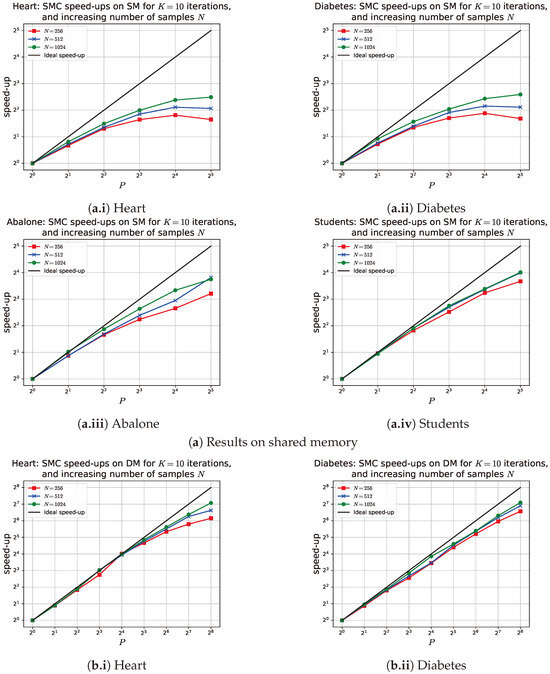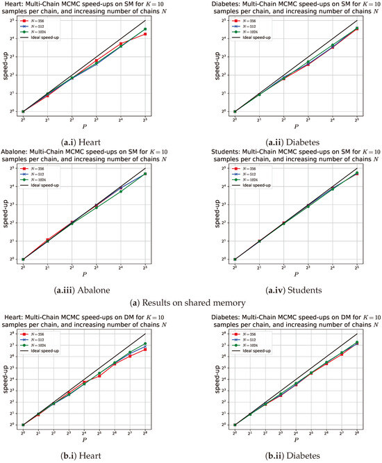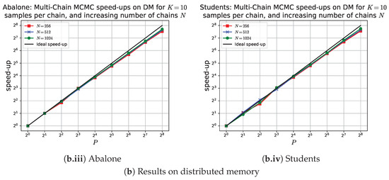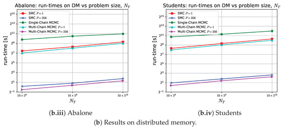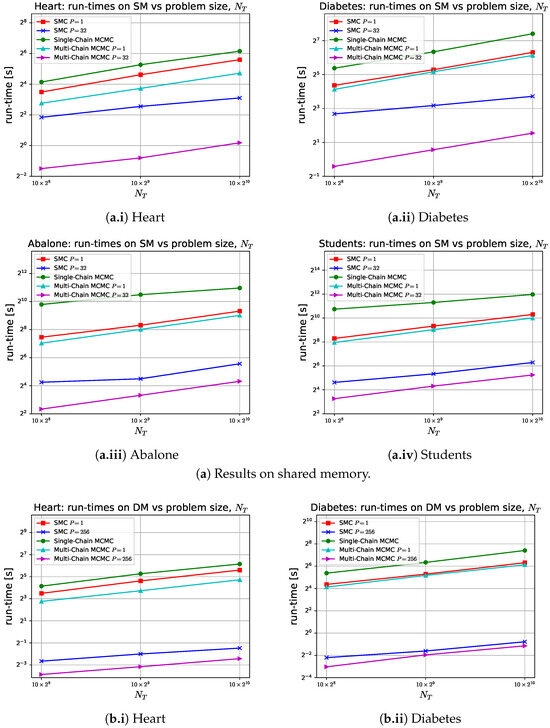 Although single-chain MCMC cannot be parallelized, multi-chain MCMC can run multiple chains in an embarrassingly parallel manner. As shown in Figure 6, multi-chain MCMC scales effectively with P and outperforms SMC in terms of runtime, by up to a factor of two (in Abalone and Students), up to a factor of four (in Diabetes), and up to a factor of six (in Heart), as indicated in Figure 4. This behavior is expected for two reasons. First, Algorithm 2 is embarrassingly parallel, while the SMC sampler has computational complexity of . Second, the constant per-sample time in multi-chain MCMC is determined solely by Equations (1)–(3). By contrast, updating each sample in the SMC sampler involves additional calculations, including proposing and weighting the new sample, as well as operations from Equations (6), (8), and (9) and Algorithm 5, with a constant time of (see Lemma 1). Despite its scalability and faster runtime, multi-chain MCMC yields lower accuracy compared to SMC and single-chain MCMC for the same fixed problem size (see Table 1). SMC achieves superior accuracy because its N samples are not only weighted but are also iteratively updated and corrected K times through sampling and resampling. In contrast, single-chain MCMC generates a single, extended chain of unweighted samples that are likely to have converged. On the other hand, multi-chain MCMC produces N independent short chains, each with unweighted samples, which are less likely to have converged.