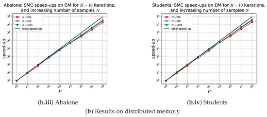 For each experiment, we include results for both SM and DM architectures, but we purposely avoid direct comparisons of the same methods (e.g., SMC) across different memory architectures, given the substantial differences between SM and DM. The results on DM are obtained on a cluster of 320 cores, equally distributed across 8 machines, each mounting 384 GB memory and a ‘2 Xeon Gold 6138’ CPU, which indeed provides 40 cores. For obvious reasons, the results on SM are obtained using only one of these 8 machines. We note that, independently of the system architecture, we always employ power-of-2 numbers of cores, as all algorithms described in Section 5 use the divide-and-conquer paradigm. Therefore, we are bound to use up to cores for the results on DM and up to cores for the results on SM. As stated in Section 2, the SM code is parallelized using OpenMP and interfaces with Python through Cython, and the DM code is also developed in Python and is parallelized by using MPI through the mpi4py library. We share our code via GitHub (https://github.com/DiscreteVariablesTaskForce/SMCDecisionTrees, accessed on 21 November 2024).