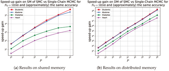 On a qualitative level, the results on DM resemble the ones presented in Section 6.1.1. Indeed, the differences are seen in terms of quantitative results. Details follow. SMC scales well with respect to itself for core; more precisely, for , SMC achieves up to a 200-fold speed-up for the largest considered dataset (Students), as Figure 5b illustrates. This means that SMC is once again able to provide roughly the same classification accuracy as single-chain MCMC (for the same problem size) but is significantly faster, as shown in Figure 7b. More precisely, the SMC sampler is able to provide the same accuracy as single-chain MCMC but is faster by up to a factor of 197 in Heart, by up to a factor of 292 in Diabetes, by up to a factor of 588 in Abalone, and by up to a factor of 640 in Students.