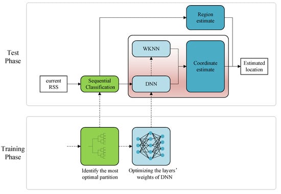 Our proposed system consists of region estimation and coordinate estimation. In the region estimation phase, a sequence of binary classification algorithms gradually locates the relevant region. In the position estimation phase, the specific coordinates are determined by the proposed fingerprint-based deep neural network architecture. Figure 1 illustrates the overall framework of our method, providing a visual overview of both phases. Next, we present more details of each phase.