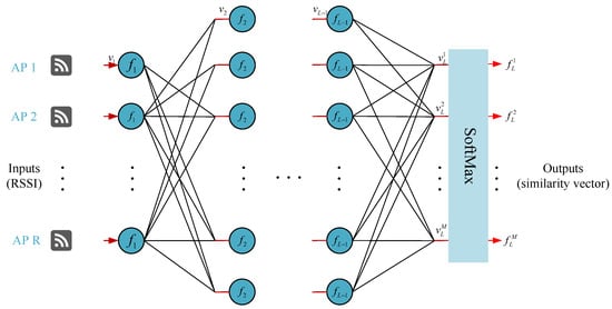 where  and  are the actual coordinates of the rth RP, and  and  are the predicted coordinates for the RP. The training process involves minimizing this error through backpropagation [], which consists of two phases: forward and backward propagation. Once optimized, the trained DNN model can directly map test RSSI samples to Cartesian coordinates.