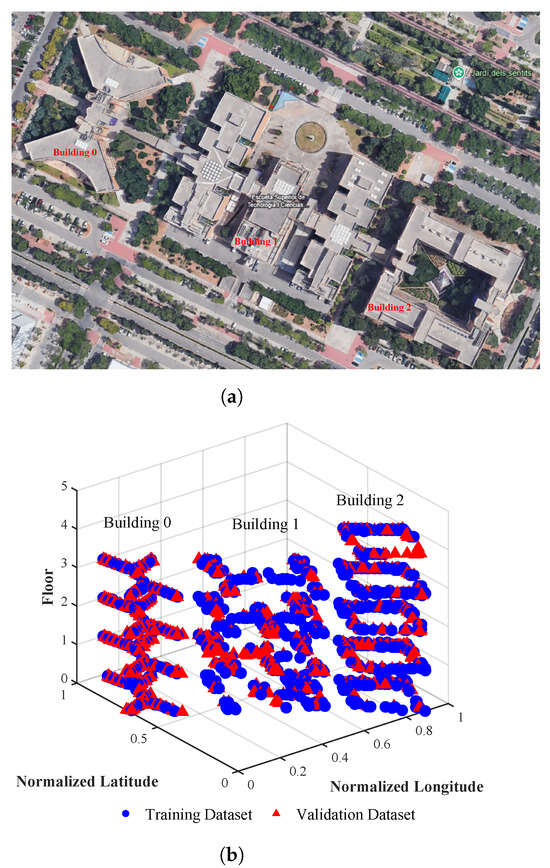 Spatial distributions. (a) Buildings on the UJI campus map from Google Earth. (b) Spatial distributions of training and validation dataset.