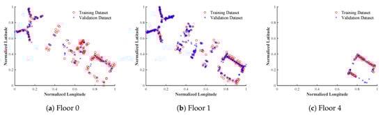 To evaluate the localization accuracy of the proposed algorithm, we employ the  dataset, which spans over 108,000  across three to five floors of buildings on the University Jaume I (UJI) campus in Spain []. The dataset consists of a training set with 19,937 records and a validation set with 1,111 records, encompassing nine fields that capture location and measurement information Specifically, the nine dimensions include coordinates, floor, building, space, relative position, user ID, device ID and timestamp  encapsulating details such as where, who and when the sample was collected. Notably, nine out of the 11 devices used in the validation dataset are distinct from those used in the training dataset, highlighting its robustness for assessing generalization. To ensure statistical independence between the training and validation datasets, the validation data were collected three months after the training data. The localization environment includes 520 wireless APs spread across three buildings (Buildings 0, 1, and 2), each consisting of four to five floors. Each observation in the dataset contains real-world coordinates (longitude, latitude, and floor) of a mobile device, along with 520 RSSI values from all detected APs. Figure 3 displays the floor plans of the three buildings on the UJI campus map, along with their respective buildings, as well as the Spatial distributions of the dataset for LONGITUDE, LATITUDE, and FLOOR.