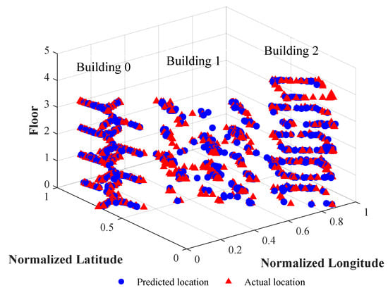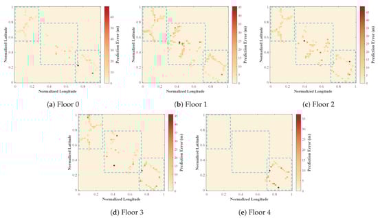 Figure 5 provides a visual comparison between the actual positions of the validation dataset and the predicted positions generated by our method. To accurately assess the prediction error, discrepancies in building and floor estimates were also considered with a uniform floor height of 4 m assumed during the evaluation. Figure 6 displays the positioning errors for test points across different floors, while Table 4 summarizes the mean positioning error for each floor across different buildings.