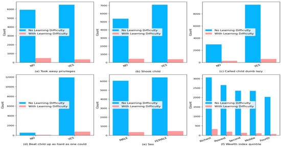 Figure 2 presents six grouped bar charts comparing the count of children with and without learning difficulties across various categories. Blue bars represent children without learning difficulties, while red bars indicate children with learning difficulties. The charts show differences in experiences and demographics, highlighting factors and patterns that might contribute to learning difficulties.