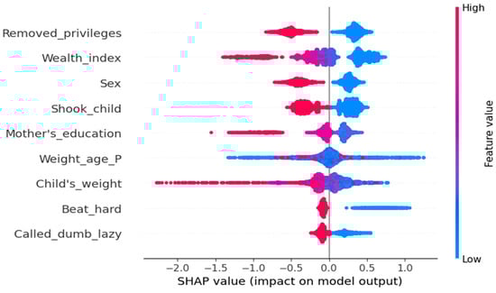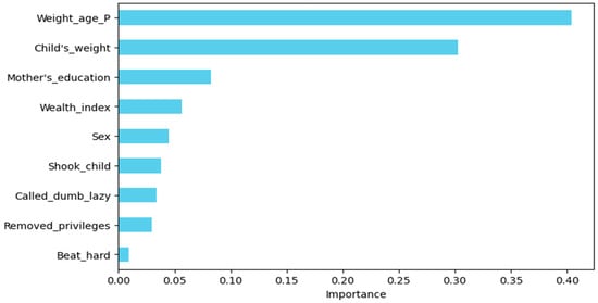 The Figure 4, derived using the RF model, highlights the most influential factors for prediction of Learning_skill. “Weight_age_P” and “Child’s_weight” are the most significant features, showing the highest impact. “Mother’s_education” and “Wealth_index” also contribute notably but to a lesser extent. Other factors such as “Sex”, “Shook_child”, “Called_dumb_lazy”, “Removed_privileges”, and “Beat_hard” show relatively lower importance in influencing the model’s output.