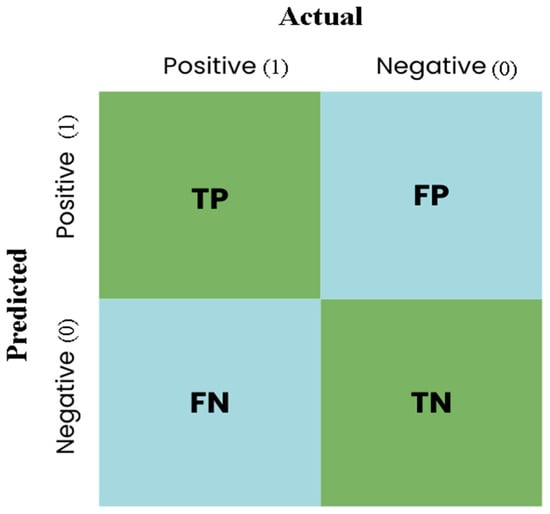 A confusion matrix is a valuable tool for evaluating the performance of a classification model by comparing the model’s predicted outcomes with the actual outcomes []. It provides a detailed summary of prediction results, which is especially useful in scenarios with imbalanced classes or when different classification errors have varying consequences. By analyzing the matrix, we can gain insights into the types and frequencies of errors the model makes, aiding in understanding its overall performance. Figure 5 depicts the matrix, which includes key terms such as true positive (TP), true negative (TN), false negative (FN), and false positive (FP). Table 4 provides a summary of the performance measurement metrics used in this study. Accuracy represents the percentage of overall correct predictions, reflecting the model’s ability to classify all cases correctly. Precision measures the rate of correct positive predictions among all predicted positive cases, indicating the model’s reliability in identifying true positives. Recall highlights the percentage of correctly identified positive cases out of all actual positive cases, showcasing the model’s sensitivity. Lastly, the F1-score combines precision and recall to provide a balanced measure of the classifier’s precision and robustness, offering insight into the model’s overall performance.
