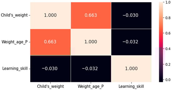 The heatmap shown in Figure 6 reveals a moderately strong positive correlation (0.663) between “Child’s_weight” and “Weight_age_P”, indicating that as a child’s weight increases, their weight-for-age percentile also tends to rise. In contrast, both “Child’s_weight” and “Weight_age_P” have weak negative correlations with “Learning_skill” (−0.030 and −0.032, respectively), suggesting that these physical growth indicators have a minimal relationship with the child’s learning skills compared to others.