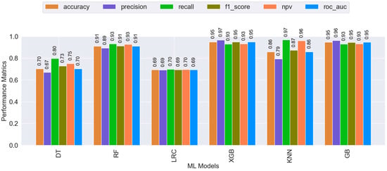 Figure 7 presents a comprehensive comparison of several machine learning algorithms applied to the MICS 2019 dataset for predicting child learning abilities. We evaluated the models using various performance metrics and assessed them through 10-fold cross-validation. Furthermore, we analyzed the performance metrics of various classification models to assess their effectiveness in predicting child learning difficulties. The DT model demonstrated moderate performance, with an accuracy of 0.70, precision of 0.67, and recall of 0.80, resulting in an F1-score of 0.73. In contrast, the KNN model showed better results with an accuracy of 0.86, a high recall of 0.97, and an F1-score of 0.87. LRC performed similarly across most metrics, with values around 0.69. The RF model performed well, achieving an accuracy of 0.91, precision of 0.89, recall of 0.93, and an F1-score of 0.91. GB and XGB yielded the best results, achieving exceptional performance metrics such as accuracy of 0.95, precision of 0.96–0.97, recall of 0.93, and an F1-score of 0.95. These models also had high NPV and ROC AUC scores of 0.93 and 0.95, respectively. This analysis suggests that GB and XGB are the most effective models for this application, outperforming other classifiers in nearly all metrics. The results show how well different ML models predict learning difficulties in children. It compares their performance using various measures that assess how accurately the models identify children with and without difficulties and how balanced their predictions are. RF, XGB, KNN, and GB perform very well, with results close to perfect, meaning they make highly reliable predictions and are good at correctly identifying both children with and without learning difficulties. In contrast, models like DT and LRC perform slightly less effectively. Their predictions are still useful but less consistent and accurate compared to the top-performing models.