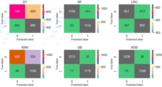 The confusion matrices in Figure 8 generated by the six different ML models DT, RF, LRC, KNN, GB, and XGB provide key insights into their effectiveness in predicting early child learning difficulties, where the outcomes are classified as either “NO DIFFICULTY” (0) or “HAS DIFFICULTY” (1). The XGB model stands out as a very good performer, with the highest number of true positives (1168) and true negatives (1208), coupled with the lowest number of false positives (36) and false negatives (79), indicating its high accuracy in identifying both children who have and those who do not have learning difficulties. Similarly, the GB model demonstrates strong performance, with slightly fewer true positives (1170), more true negatives (1212), and very few false positives (32), making it another reliable option. The RF model also performs well, with a favorable balance of true positives (1154) and true negatives (1100), though it has a moderate number of false positives (144) and false negatives (93), indicating some room for improvement in reducing misclassifications. The KNN model, despite its strong identification of true positives (1199), struggles with a higher number of false positives (324), making it less reliable in correctly identifying children without learning difficulties. The LRC, however, has a significant number of false negatives (397), posing a risk of under-detection. The DT model, with a substantial number of false positives (500), indicates a tendency to over-predict learning difficulties. Overall, XGB and GB emerge as the most effective models, offering the best balance between accurately predicting both classes and minimizing errors.