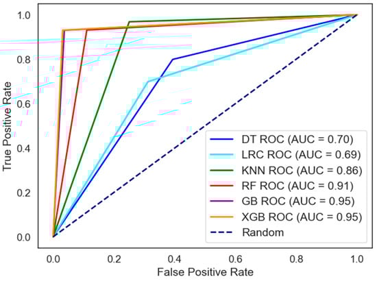 The ROC AUC curves in Figure 9 present a comparative analysis of six ML models applied to a dataset on child learning difficulties. The XGB and GB models, indicated by the orange and purple curves, respectively, both achieved the highest ROC AUC of 0.95, demonstrating their exceptional ability to differentiate between classes. The RF model, represented by the red curve, also performed well with an ROC AUC of 0.91, though it lagged slightly behind XGB and GB. In contrast, the DT, LRC, and KNN models, represented by blue, cyan, and green curves, respectively, each achieved an ROC AUC of 0.70, 0.69, and 0.86. This suggests that these models are less effective compared to the top-performing XGB, GB, and RF models. Overall, the analysis indicates that XGB and GB are the most effective models for predicting child learning difficulties, with RF following closely behind, while DT, LRC, and KNN exhibit lower classification performance.