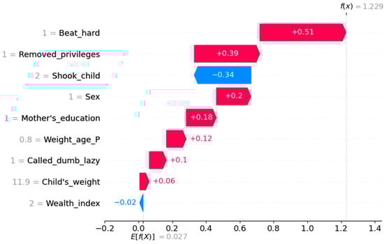 - Negative parenting behaviors: Shaking the child (NO = 2) and beating hard (NO = 2) slightly decreases the likelihood of learning difficulties, but calling the child dumb/lazy (YES = 1) contributes to the prediction of have difficulties, reinforcing the model’s overall prediction.