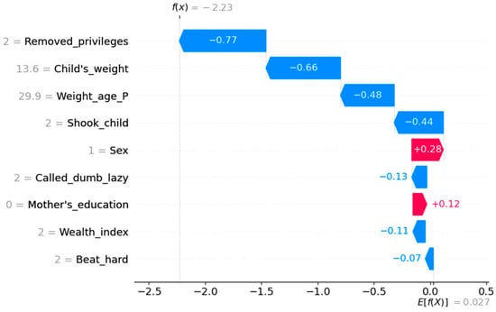 - The factors of the child’s weight (11.28) and weight–age percentile (1.30) significantly contribute to the prediction of learning difficulties because the child’s low weight and weight-for-age percentile suggest poor health, which is often associated with developmental challenges;