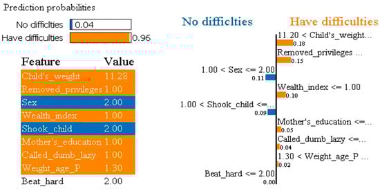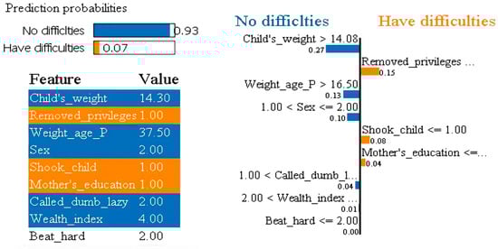 LIME plot explaining prediction of the presence of learning difficulties in a child.