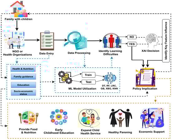 Figure 15 illustrates a structured framework that outlines a data-driven approach for predicting and addressing early childhood learning difficulties. It integrates family data collected by NGOs or health organizations, focusing on health, nutrition, family guidance, education, and socioeconomic status. Data were entered, processed, and analyzed through ML models to make predictions. XAI techniques were applied to identify key factors influencing learning difficulties, enhancing the interpretability of results. The identified learning gaps inform targeted policy implications and interventions, such as early childhood education, health services, parenting support, nutritional programs, and economic assistance. This framework provides actionable insights to address disparities and improve educational outcomes through informed policymaking.