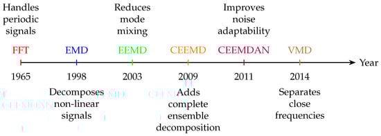 Timeline of signal analysis techniques, from FFT to VMD. Advantages are broken into lines for improved readability.