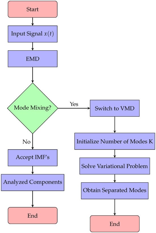 In more recent developments, Variational Mode Decomposition (VMD) has been introduced as an advanced technique for adaptive signal decomposition, addressing mode mixing through a variational approach []. This technique represents a significant evolution in signal analysis methods as illustrated in the Figure 1, offering a robust alternative to EMD for analyzing nonlinear and nonstationary signals.