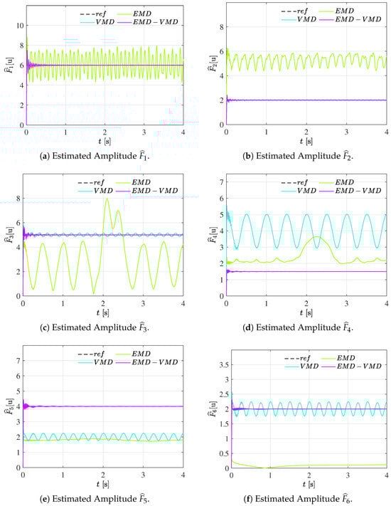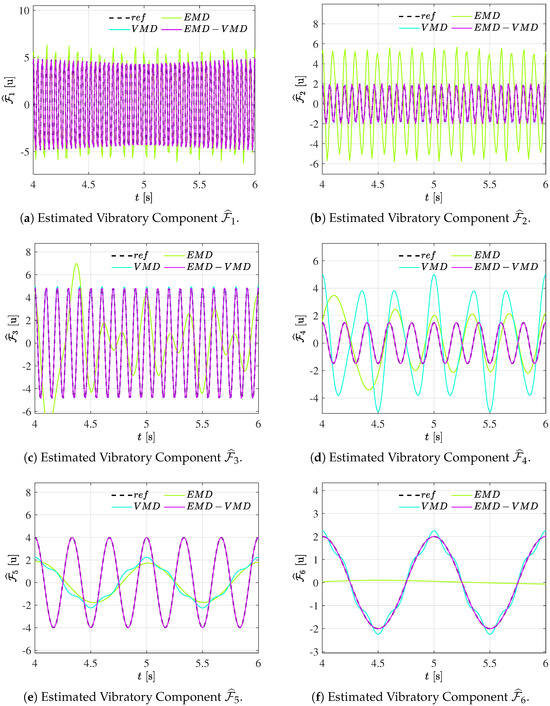 The third case study addresses a complex signal composed of six vibratory components with very close frequencies. This scenario is particularly challenging for conventional EMD due to mode mixing. The hybrid EMD–VMD strategy proves its usefulness by detecting mode mixing and providing crucial information about the number of vibratory components, thereby improving the accuracy and efficiency of estimation using VMD.